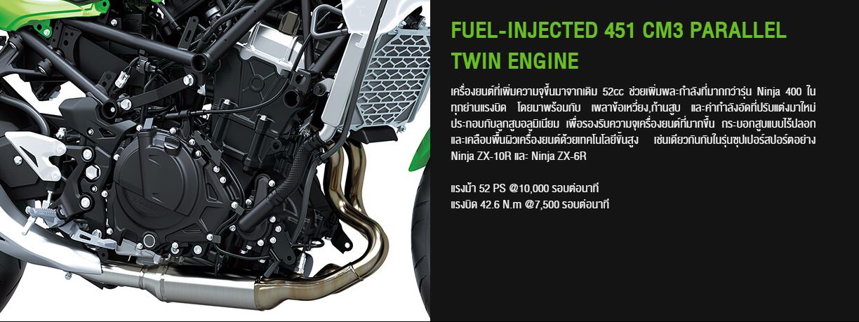 และเครื่องยนต์พัฒนาใหม่ ขนาด 451 ซีซี ที่ให้พละกำลังในช่วงรอบต่ำถึงกลางได้เป็นอย่างดี หรือแม้แต่ในย่านความเร็วสูงก็ทำความเร็วสูงสุดได้อย่างง่ายดาย และด้วยกำลังที่สมดุลและอัตราเร่งที่แข็งแกร่งตลอดทุกรอบเครื่องยนต์ ผสานเข้ากับแชสซีน้ำหนักเบาจึงเหมาะกับการขับขี่ในหลากหลายสถานการณ์รวมถึงในชีวิตประจำวัน เพราะคาวาซากิมุ่งหวังให้นักขับขี่เข้าถึงตัวรถได้ง่ายที่สุด เราจึงทุ่มเทให้กับการออกแบบแชสซี ที่นอกจากน้ำหนักที่เบาแล้ว ยังคล่องแคล่วและมีจุดศูนย์ถ่วงที่สมดุล ให้ความมั่นใจในการขับขี่แก่นักบิดมือใหม่และมือเก๋า