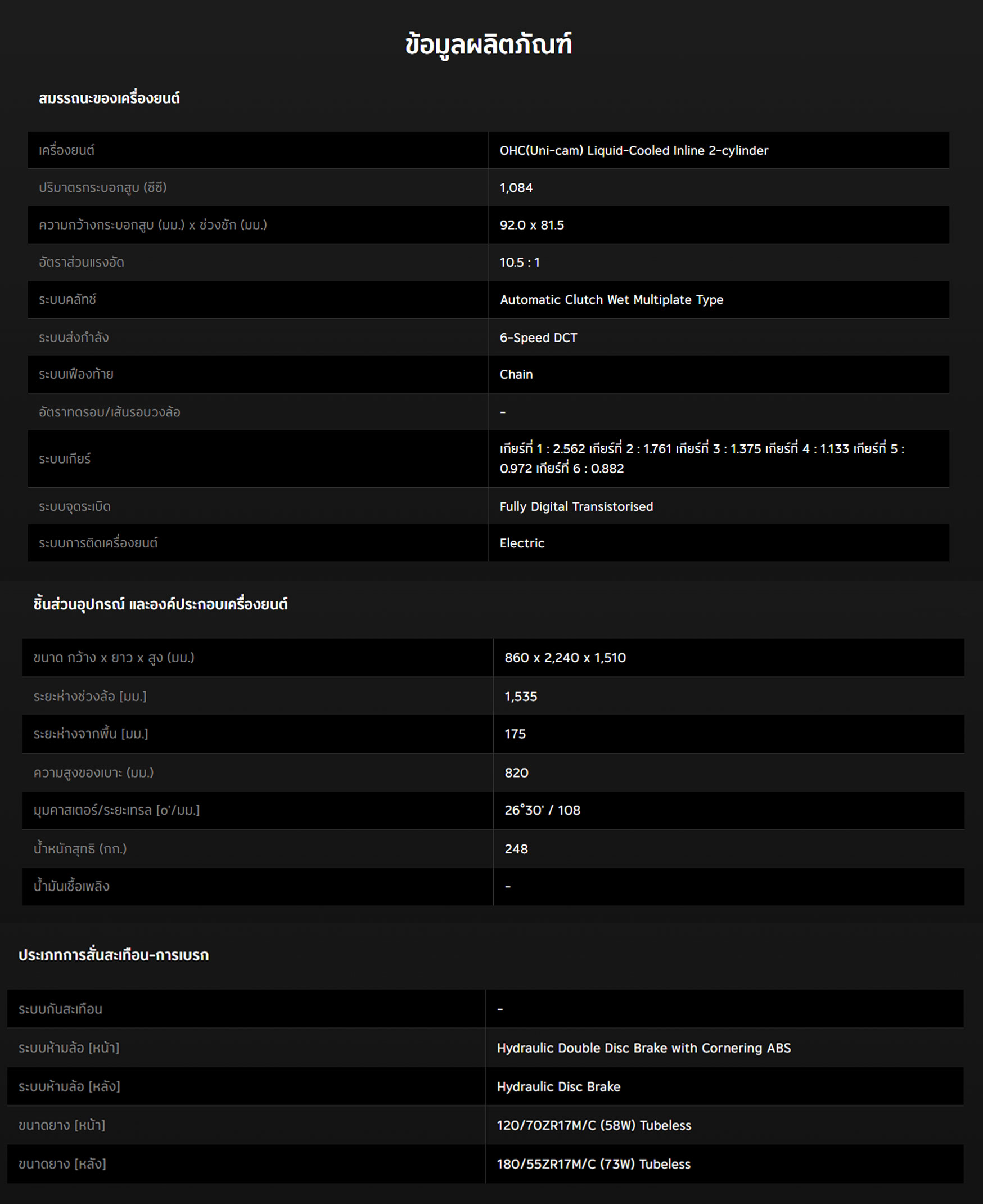 ขุมพลังจากเครื่องยนต์ 2 สูบเรียง 4 จังหวะ 8 วาล์ว ระบายความร้อนด้วยน้ำ มอบพละกำลังสูงสุด 100.5 แรงม้า ที่ 7,500 รอบ/นาที แรงบิดสูงสุด 104 นิวตันเมตร ที่ 6,250 รอบ / นาที ส่งกำลังด้วยระบบเกียร์อัตโนมัติ DCT 6 สปีด ขับเคลื่อนด้วยโซ่