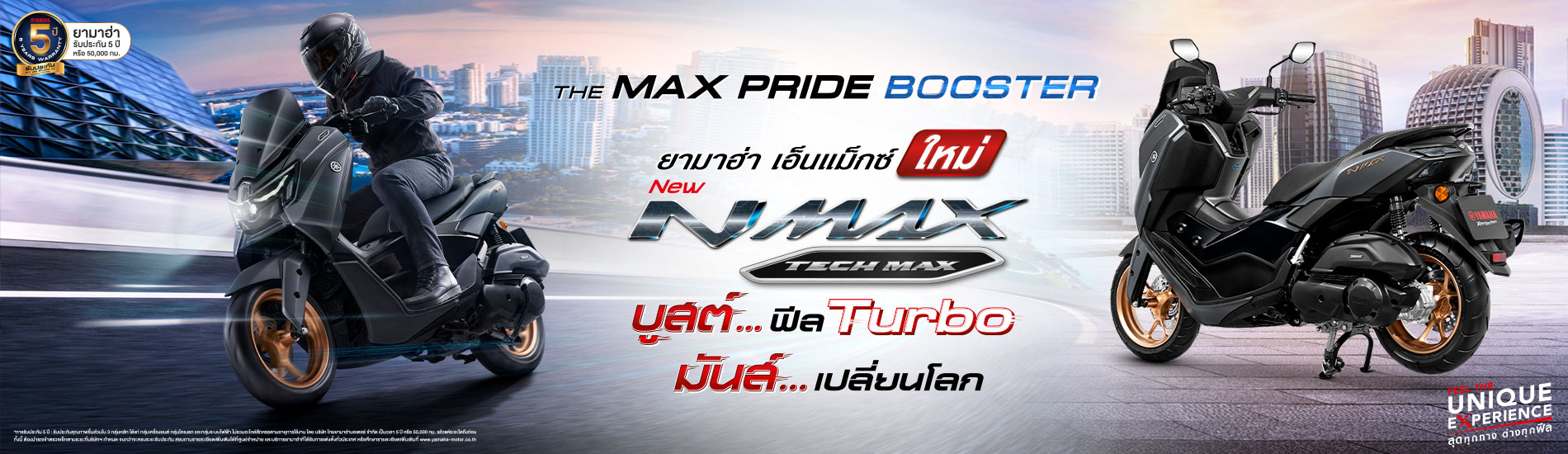 ยามาฮ่า เอ็นแม็กซ์ ใหม่! NEW YAMAHA NMAX “THE MAX PRIDE BOOSTER” บูสต์…ฟีล Turbo มันส์…เปลี่ยนโลก ออโตเมติกพรีเมียมสปอร์ต 155 ซีซี สีใหม่เพิ่มความสปอร์ตขึ้นอีกขั้น พัฒนาสู่ความสมบูรณ์แบบรอบคัน เทคโนโลยีใหม่เหนือระดับในคลาส 150 ด้วยระบบ YECVT บูสต์อัตราเร่งให้มันส์ได้อารมณ์อย่างเทอร์โบ แบบเกียร์สปอร์ตในรถยนต์ พร้อมฟีเจอร์ล้ำสมัย ที่จะพาคุณเปิดโลกใหม่ในการขับขี่ที่สนุกเร้าใจยิ่งขึ้น คุ้มค่ากว่าด้วยการรับประกันมากกว่าถึง 5 ปี หรือ 50,000 กิโลเมตร*